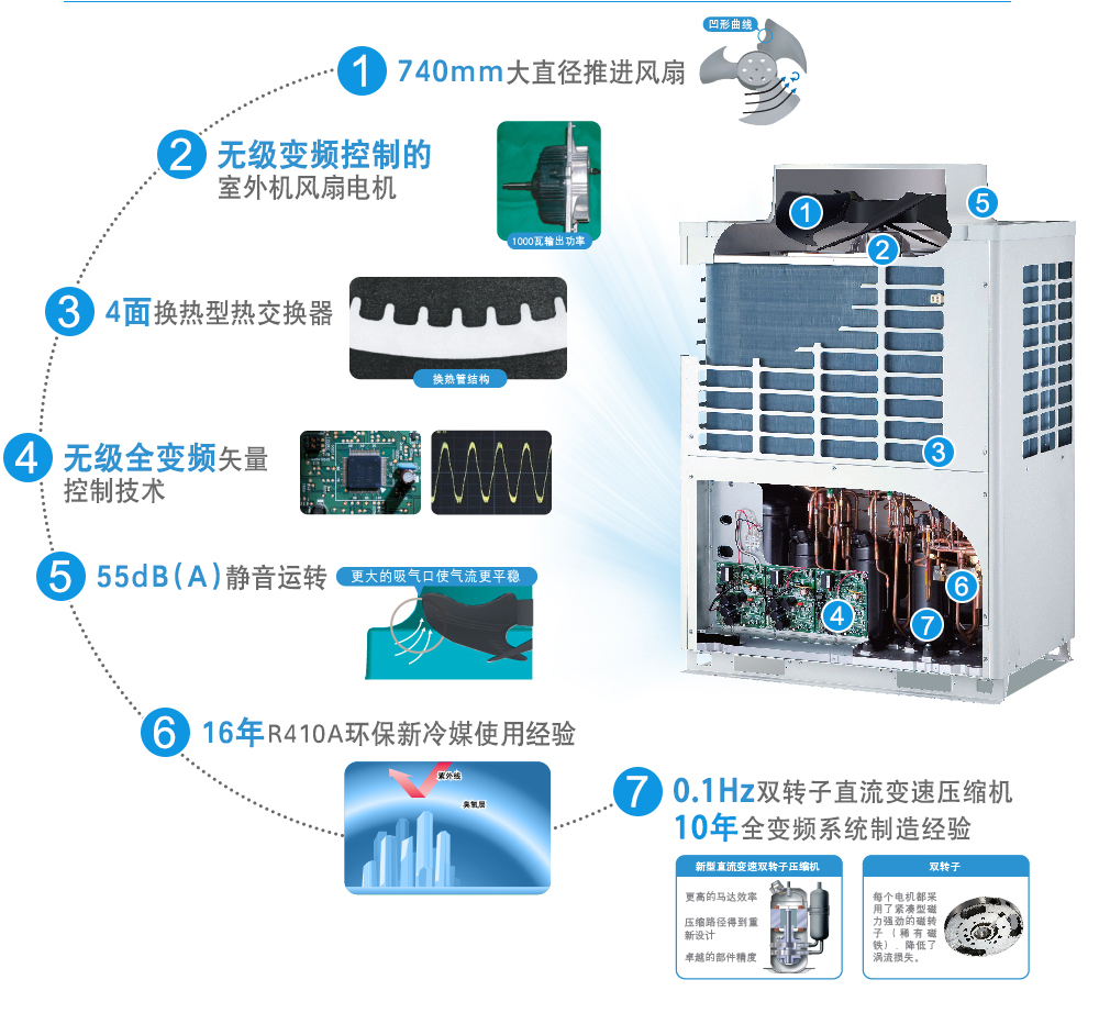 在單台高(gāo)效能室外機中 首次采用3台壓縮機3組變頻器(qì)