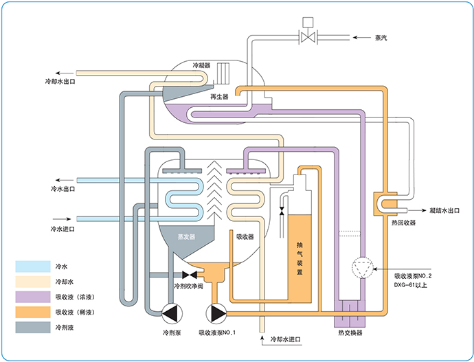 本公司生(shēng)産的DXG系列蒸汽單效溴化锂吸收式制(zhì)冷機,由蒸發器(qì)、吸收器(qì)、冷凝器(qì)、再生(shēng)器(qì)和(hé)熱交換器(qì)、熱回收器(qì)、溶液泵、冷劑泵等組成。
